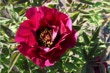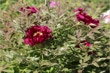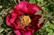 Strauchpfingstrose. Sämling 5R2. Offene Absaat von ’Prof. Hong Tao’ (reg. APS 2018). Erste Blüte 2012. Einfache Blütenform mit 2-3 Reihen Petalen, eine Blüte pro Stängel mit 18-20 cm Durchmesser. Aufrechte kirschrote Blüten (RHS CC 46A) mit schwarzen Basalflecken, die ein Drittel der Blütenblätter einnehmen. Die Petalen schalenförmig leicht gewellt. Fünf Karpelle schwach grün, leicht haarig. Rote Narben, Staubfäden rot blass rosa verlaufend. Pollen. Scheide rosa. Fertil. Duft. Frühe bis mittlere Blütezeit. Aufrechtes Wachstum 120 - 150 cm. Vermehrt und verbreitet durch Wolfgang Gießler Groß Rosenburg.