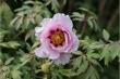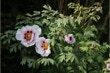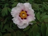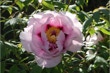 Seedling 99/034. Parentage: Raised from open polliated mixed Gansu Mudan seeds. First bloomed 1999. First propagated 2014. SINGLE with 2-3 rows of petals. One flower per stem, 16 cm (6¼") in size. Fragrance. Dark red flares extend quarter of petal's length, with bleeding edges. Petals pale pink fading to white at tips. Carpels white, moderately hairy, 5 in number. Stigmas white, normal anatomy. Pollen-bearing stamens, filaments dark pink at base, grading to white at the tips. Sheath white, complete. Blooms early/mid-season. Typical Gansu Mudan foliage. Spreading upright growth habit to 100 cm (40"). Has a lovely flower character with petals held cupped, hence the name which is an archaic adjective meaning sweet or lovely, now remaining as a musical term to indicate tender or gentle. Like its sister seedlings it is a healthy and vigorous plant. To be propagated and distributed by W. Giessler, Gross Rosenburg, Germany.