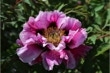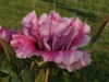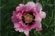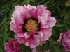 Seedling 1R08. Parentage: P. rockii ssp. linyanshanii open pollinated. First bloomed 2010. First propagated 2014. SINGLE with 2-3 rows of petals. One flower per stem, 18-20 cm (7-8") in size. Flowers would be classed as pink. Pigment is not evenly distributed. Darker pink erupts from the flares, streaking and thinning towards petal edge into a background of white. Dark red flares extend about a third of petal's length, with margins somewhat bleeding. Petals cupped, some twisting, edges somewhat ruffled. Carpels white, moderately hairy, 5 in number. Stigmas white, normal anatomy. Pollen-bearing stamens, filaments white. Sheath white, complete. Fragrance. Blooms early/mid-season. Spreading upright growth to 160 cm (63"). It is an open pollinated F1 seedling of species P. rockii ssp. linyanshanii, and a sister seedling of 'Morganit' and 'Rhodonit'. The difference betweeen P. rockii and P. rockii ssp. linyanshanii is: the height of the plants up to 250 cm, the tough woody character of stems, the lanceolate leaflets, the flower size of up to 25 cm, the bud size of 5 cm more than double that of P. rockii. Sheath and filaments of the species are always white, while hybridized plants can have colored ones. To be propagated and distributed by W. Giessler, Groß Rosenburg, Germany.