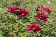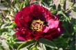 Strauchpfingstrose. Sämling 5R2. Offene Absaat von ’Prof. Hong Tao’ (reg. APS 2018). Erste Blüte 2012. Einfache Blütenform mit 2-3 Reihen Petalen, eine Blüte pro Stängel mit 18-20 cm Durchmesser. Aufrechte kirschrote Blüten (RHS CC 46A) mit schwarzen Basalflecken, die ein Drittel der Blütenblätter einnehmen. Die Petalen schalenförmig leicht gewellt. Fünf Karpelle schwach grün, leicht haarig. Rote Narben, Staubfäden rot blass rosa verlaufend. Pollen. Scheide rosa. Fertil. Duft. Frühe bis mittlere Blütezeit. Aufrechtes Wachstum 120 - 150 cm. Vermehrt und verbreitet durch Wolfgang Gießler Groß Rosenburg.