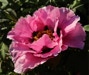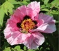 Seedling 3R13. Parentage: Open pollinated seedling of 'Allegro'. First bloomed 2012. First propagated 2016. SINGLE with 2 rows of petals. One flower per stem, 20 cm (8") in size. Large soft pink petals, nicely cupped, 8 cm (3") in width. Black flares extend 30% of petal's length, with bleeding edges. Carpels white, moderately hairy, 5 in number. Stigmas white, normal anatomy. Pollen-bearing stamens, filaments pink at base, white at the tips. Sheath red, complete. Fragrance. Blooms early/mid-season. Typical Gansu Mudan foliage of good substance. Spreading upright growth habit to 100 cm (40"). Vigorous and healthy plant. To be propagated and distributed by W. Giessler, Groß Rosenburg, Germany.
