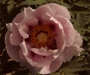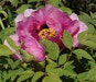 Strauchpfingstrose. Seedling 99/033. Parentage: Raised from open polliated mixed Gansu Mudan seeds. First bloomed 1999. First propagated 2014. SEMI-DOUBLE with 3 rows of petals. One flower per stem, 18 cm (7") in size. Pink petals with black flares extending 20% the petal’s length. Flares have a blurred edge. Petals are cupped. Carpels white, moderately hairy, 5 in number. Stigmas same shade as petals, normal anatomy. Pollen-bearing stamens, filaments pink at base, white at tip. Sheath pink red, complete. Fragrance. Blooms early/mid-season. Typical Gansu Mudan foliage. Spreading upright growth to 130 cm (51"). Like its sister seedlings 'Quintett', 'Mattinata', and 'Amabile', a healthy and vigorous plant. To be propagated and distributed by W. Giessler, Gross-Rosenburg, Germany.
