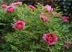 Strauchpfingstrose. Seedling 99/033. Parentage: Raised from open polliated mixed Gansu Mudan seeds. First bloomed 1999. First propagated 2014. SEMI-DOUBLE with 3 rows of petals. One flower per stem, 18 cm (7") in size. Pink petals with black flares extending 20% the petal’s length. Flares have a blurred edge. Petals are cupped. Carpels white, moderately hairy, 5 in number. Stigmas same shade as petals, normal anatomy. Pollen-bearing stamens, filaments pink at base, white at tip. Sheath pink red, complete. Fragrance. Blooms early/mid-season. Typical Gansu Mudan foliage. Spreading upright growth to 130 cm (51"). Like its sister seedlings 'Quintett', 'Mattinata', and 'Amabile', a healthy and vigorous plant. To be propagated and distributed by W. Giessler, Gross-Rosenburg, Germany.